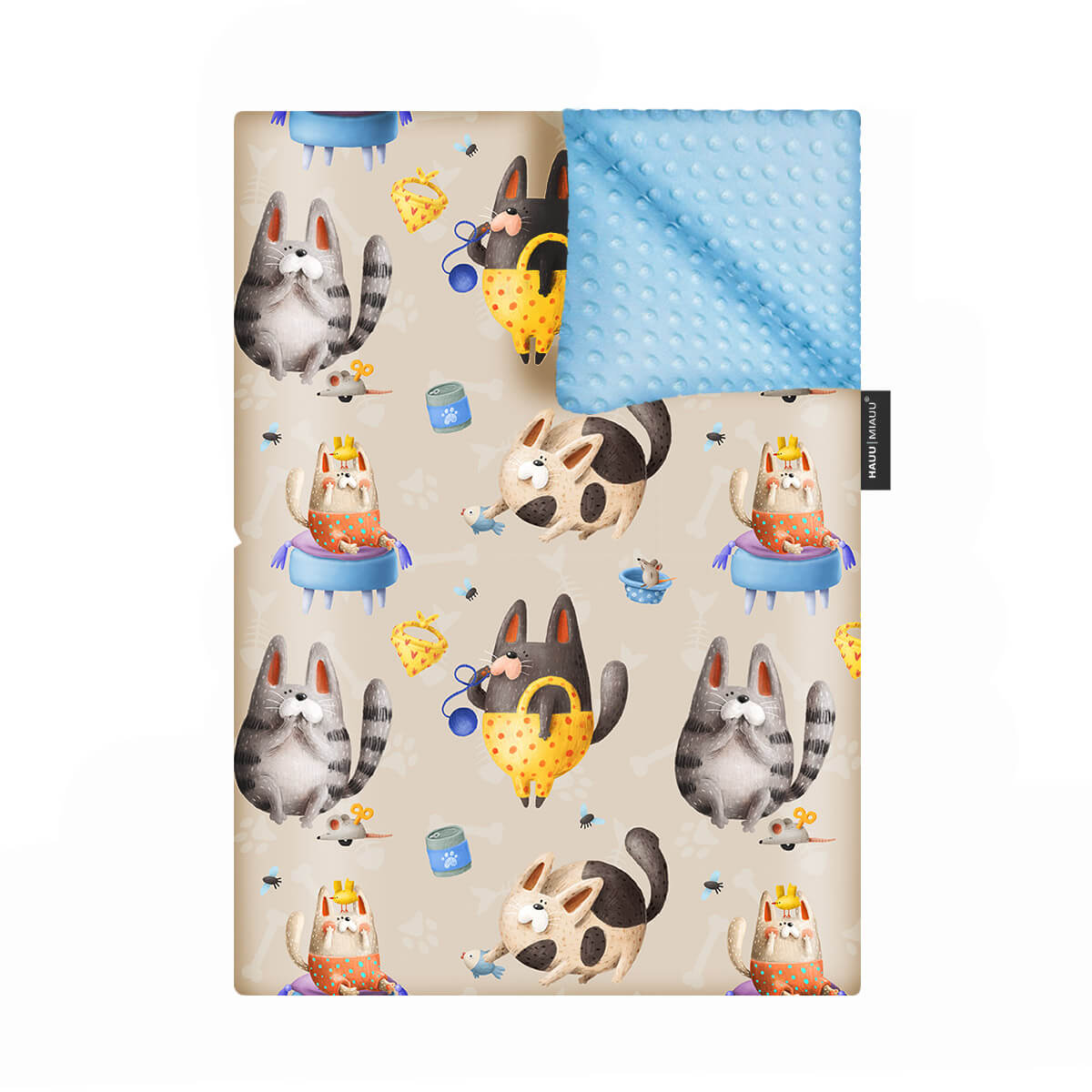 Autorski kocyk dla kota jakości premium, wykonany z 2 warstw: kolorowego, miękkiego velvetu w kotki oraz grubego polaru minky.