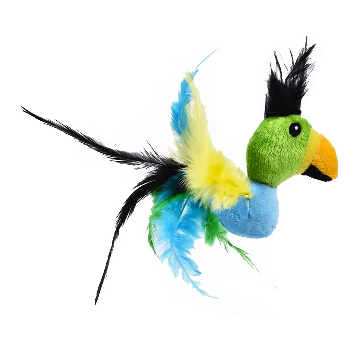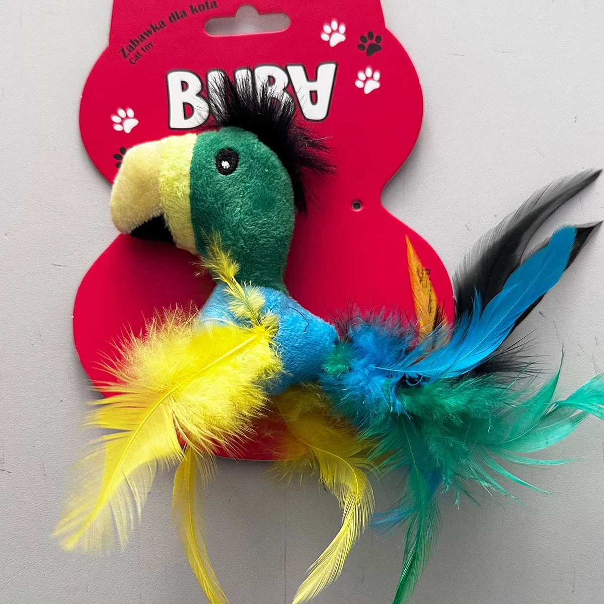 Pluszowy ptak - papuga z piórami o wysokości 10cm, szerokość wraz z piórami ok. 16cm.