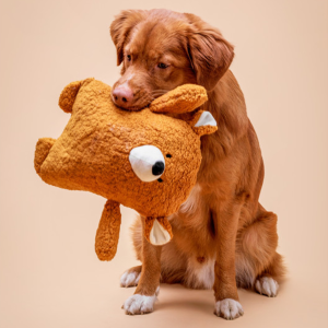 Miękki, brązowy miś, rekomendowany dla psów średnich i większych ras. Wykonany z poliestru z recyklingu, wspiera ekologiczne podejście do produkcji zabawek dla psów. Niedźwiedź wydaje piszczące i szeleszczące dźwięki, które uatrakcyjniają zabawę.