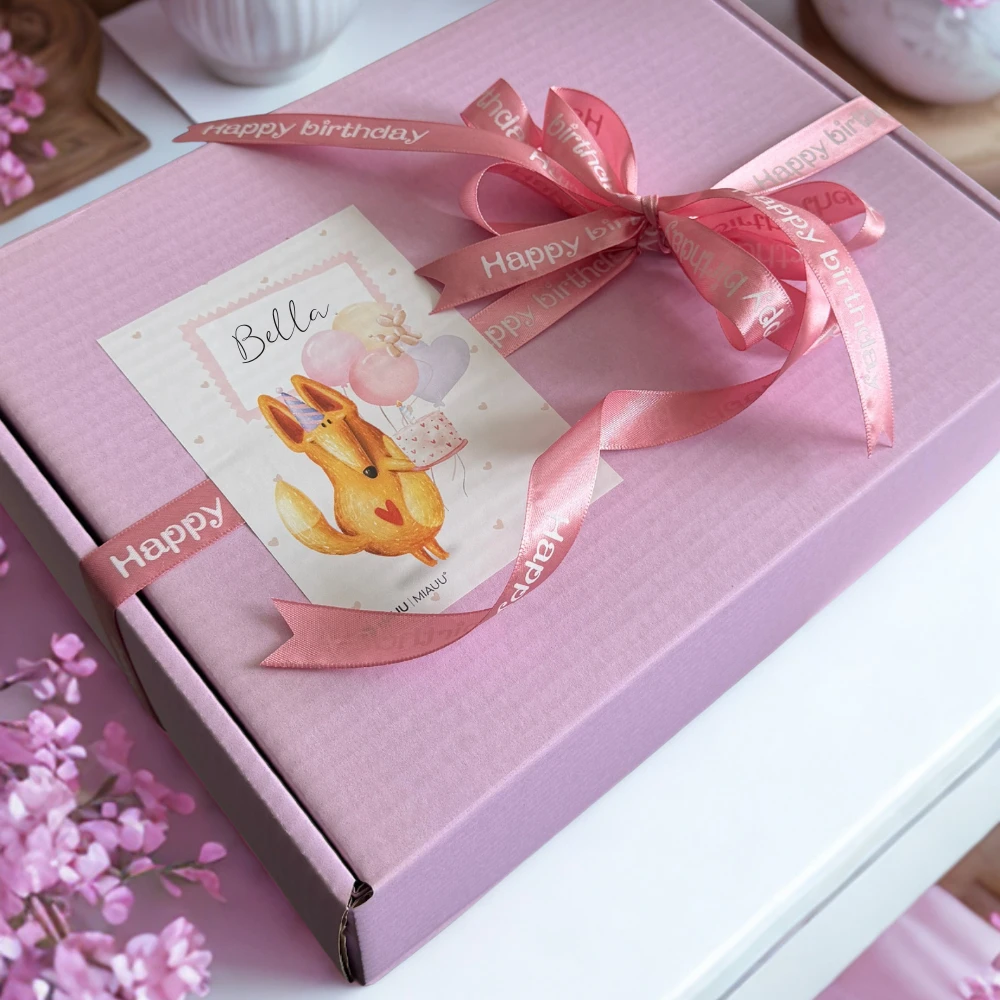 - całość zwieńczona śliczną różową bibułą, urodzinową wstążką i urodzinową naklejką z imieniem suczki (w przypadku braku imienia w formularzu zamówienia, pole pozostanie do samodzielnego wypełnienia)