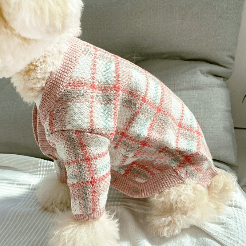Luksusowy, przecudowny sweterek / kardigan w przepięknym odcieniu pastelowego różu w modną kratę. Zapewni Twojemu Pupilowi nie tylko ochronę przed chłodem zimne dni. Sweterek z rękawkami, zapinany na guziczki. Posiada wyprofilowane wycięcie w dolnej części brzuszka.