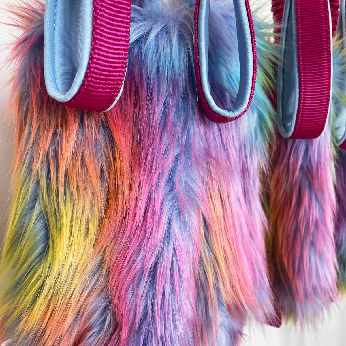 - futerko: TĘCZOWY (odcienie niebieskiego, błękitu, fioletu, różowego, zielonego, limonkowego, żółtego). Każdy egzemplarz ma unikalne rozłożenie barw tęczowego futerka).