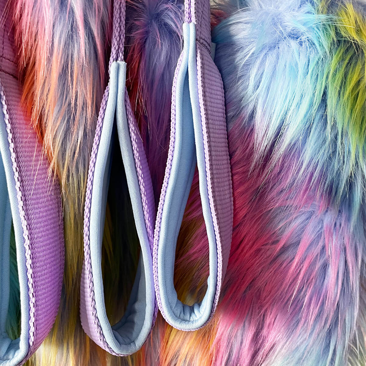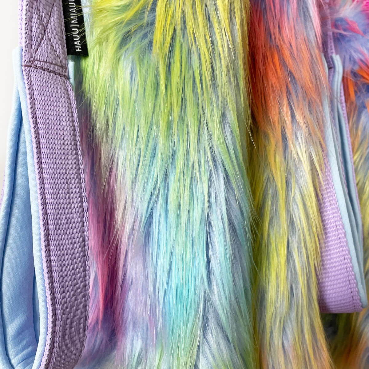 - futerko: TĘCZOWY (odcienie niebieskiego, błękitu, fioletu, różowego, zielonego, limonkowego, żółtego). Każdy egzemplarz ma unikalne rozłożenie barw tęczowego futerka).